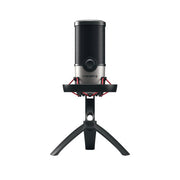 What immediately catches the eye with this streaming microphone is the high-quality workmanship: The three-legged base is made entirely of metal and ensures a firm and secure stand at all times. The minimalist design in black with matt silver looks discreet and elegant at the same time. As a visual highlight, the rubber bands for the shock mount function give the microphone the finishing touch. These are in the familiar CHERRY red - designed in Germany.