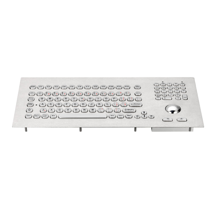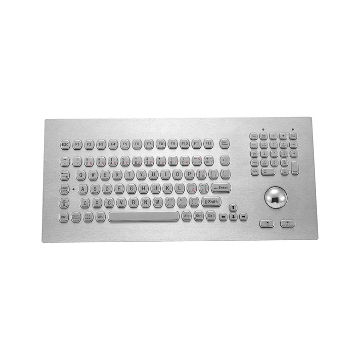 With small circular keys, this stainless steel keyboard comes full size with an integrated 38mm mechanical trackball and numeric keypad on the right-hand side.