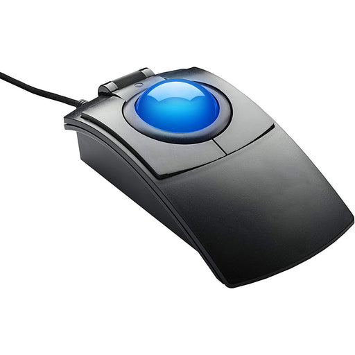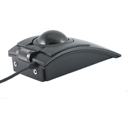 Black USB Laser Trackball with black buttons and blue scroll wheel with LED. Two additional input jacks are located at top of Trackball allow you t...