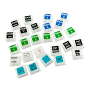 - Additional Keys: 42 key blockers with 2 key blocker, 26 single clear acrylic keys with blue, green, white, and black backgrounds