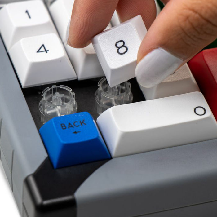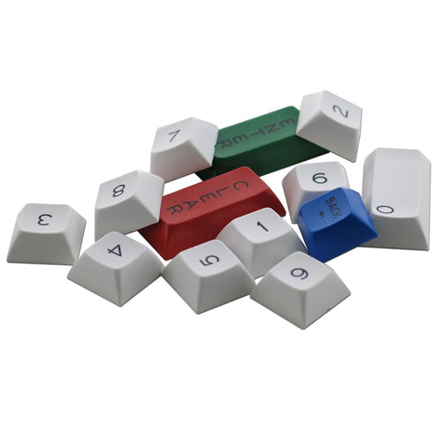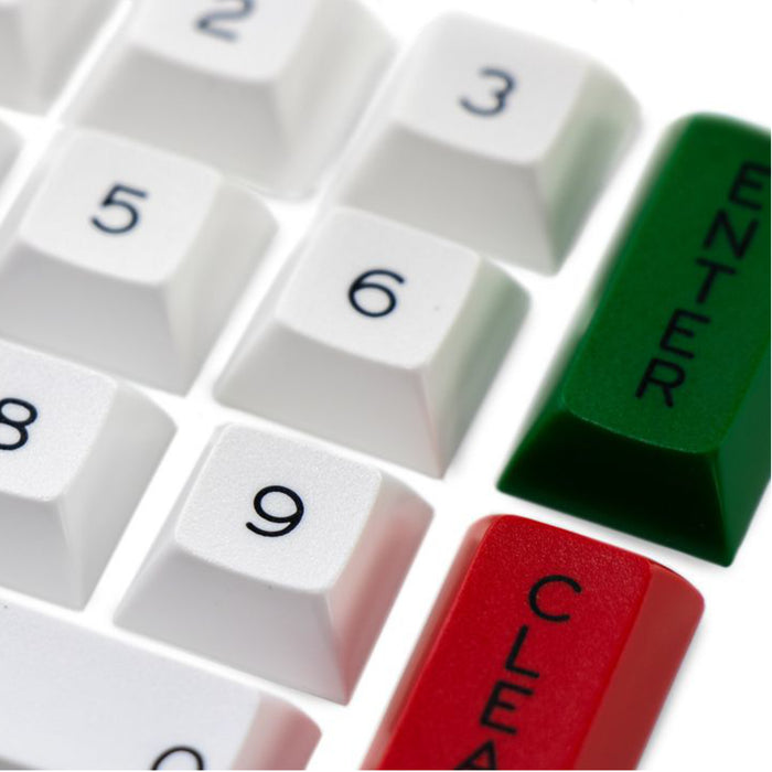 - Additional Keys: Numbers 0-9 on single white keys, red and green tall keycap with "Enter" and "Clear" printed and Single blue keycap with "back" printed on it.