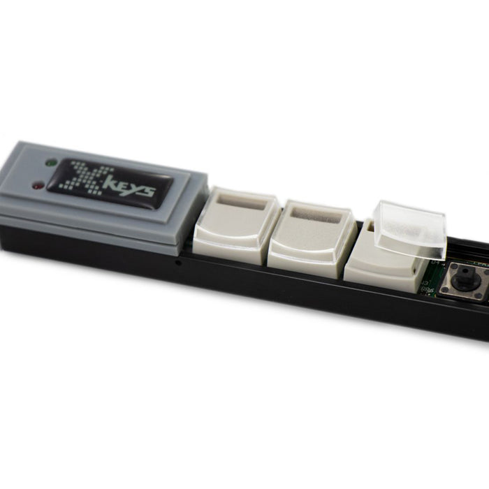 X-keys key sticks (such as the XK-4, XK-8 and XK-16) use a low profile tactile switch with a square stem, so replacement keycaps for these must be different to that of a normal X-keys unit. Keyboard Specialists offer single replacement keycaps for the X-keys key stick collection with a backlighting window, allowing the blue LED to illuminate the key legend from the back.