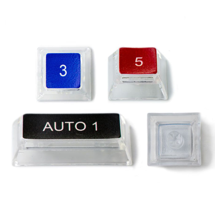 • Wide clear acrylic keys with a grey background and “AUTO 1”, “AUTO 2”, “AUTO 3” and “TAKE” printed on the keys.