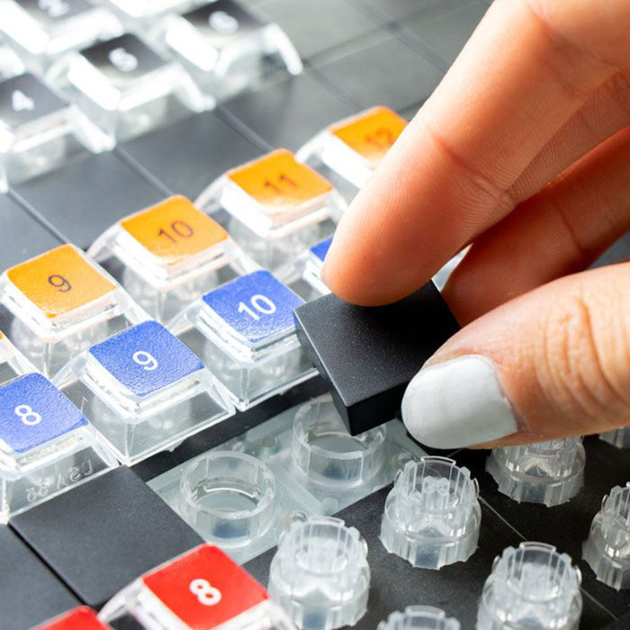 • Numbers 1 – 12 on single, clear acrylic keys with red, blue, green and orange backgrounds.
